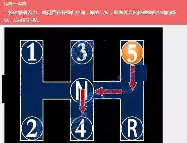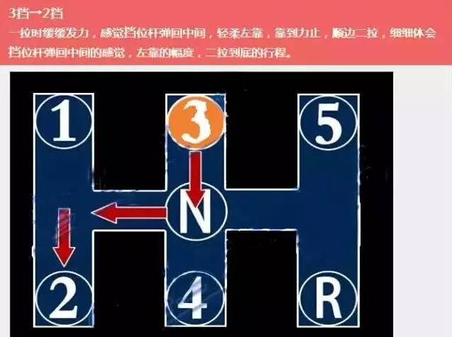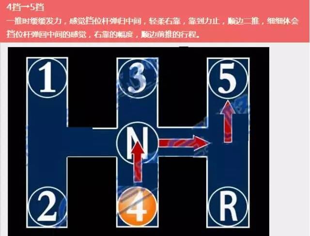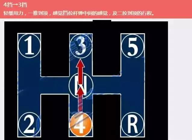 挂挡时,用力要轻柔,轻快,忌生猛,轻快----轻了才可快,不需太快,以一,两秒以上为佳,按照要领,动作清晰,幅度行程到位[到位时,用力可滞重,即暗力,确保入挡],在左,右[1,3,5]挡位,换到中间挡[3,4]时,只需前后用力,横向应利用其自身的弹性,回归中间空挡位置,切忌左右用力,反而偏离空挡。